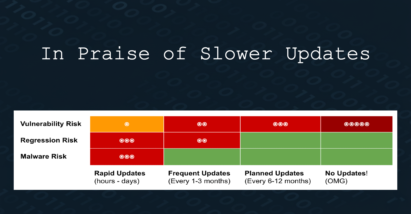 - Internet-reachable, credibly exploitable vulnerabilities: fix within 3 days.